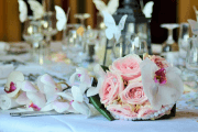 White can look quite stark on a table, so consider decoration ideas of taupe or grey cloths to make your wedding venue look warmer and more chic, especially if your flowers have a fresh white, cream and green colour scheme. If you are going for a brightly coloured or printed cloth, stick to white flowers or pick out a colour from the cloth and match it to one of the flowers in the vases to tie your wedding decoration scheme together.